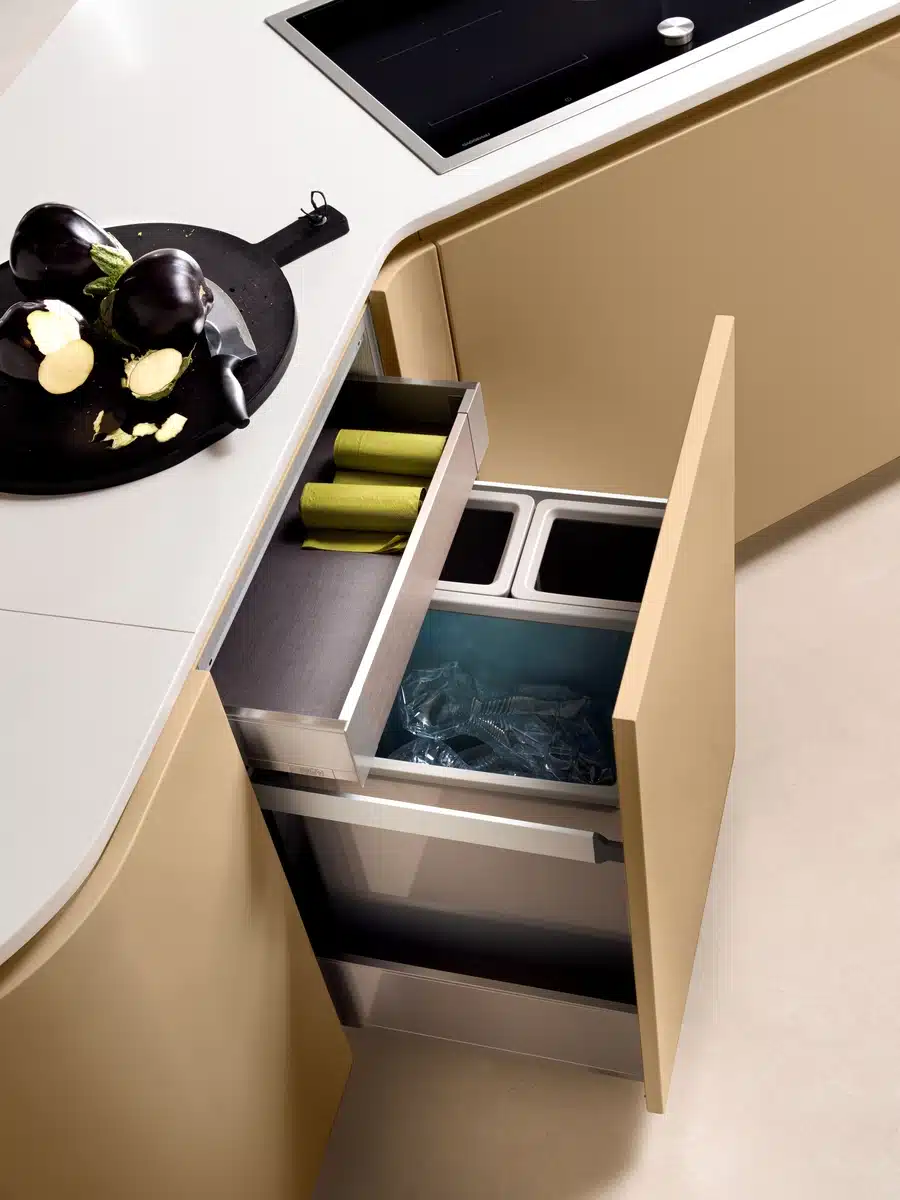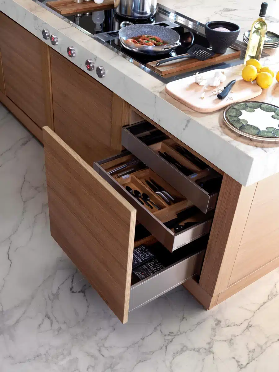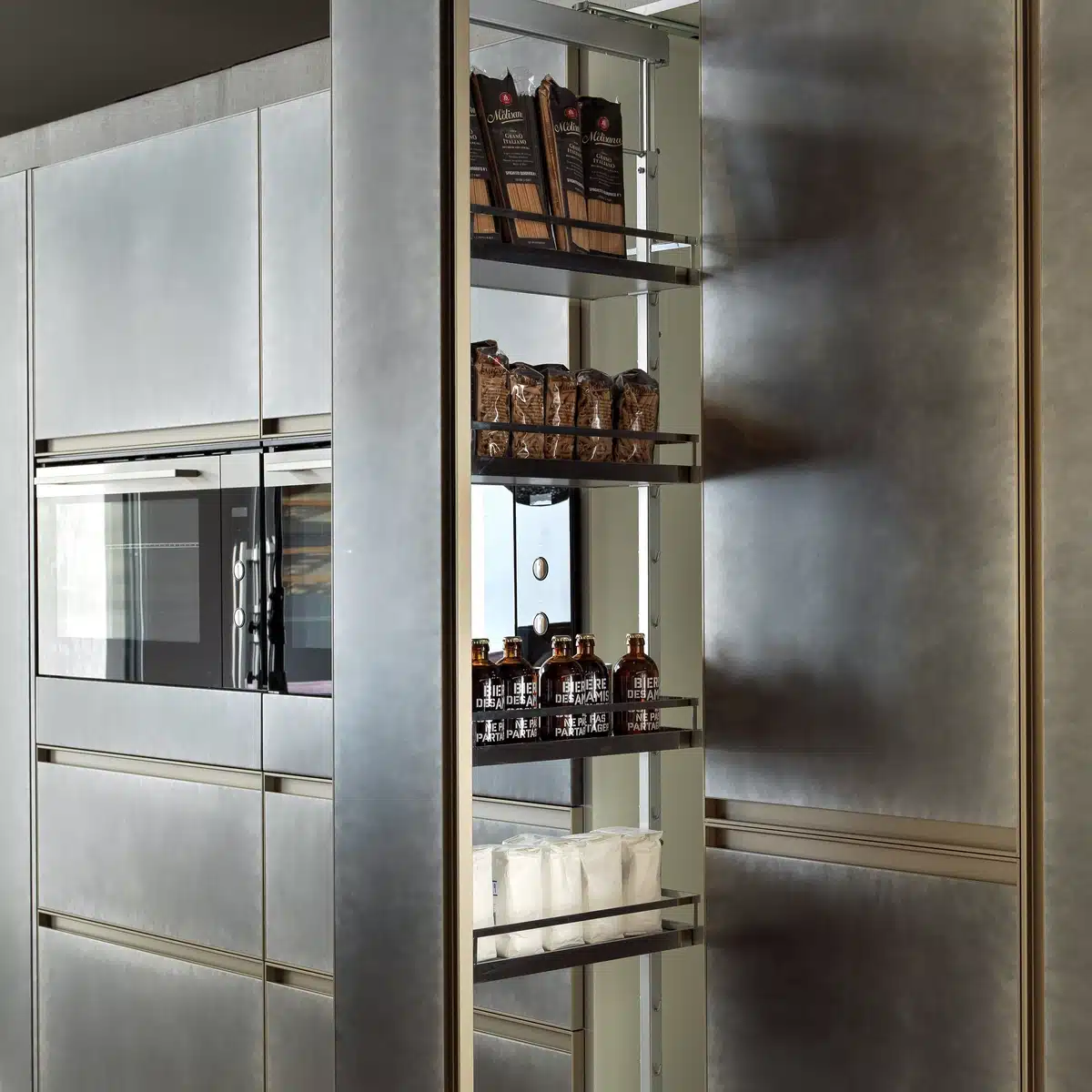 Accanto ai sistemi di contenimento tradizionali trovano spazio anche carrelli estraibili, particolarmente utili in presenza di nicchie o spazi ridotti. In particolare nelle cucine lineari e angolari, questi elementi consentono di sfruttare anche larghezze minime migliorando l’organizzazione senza appesantire il progetto.