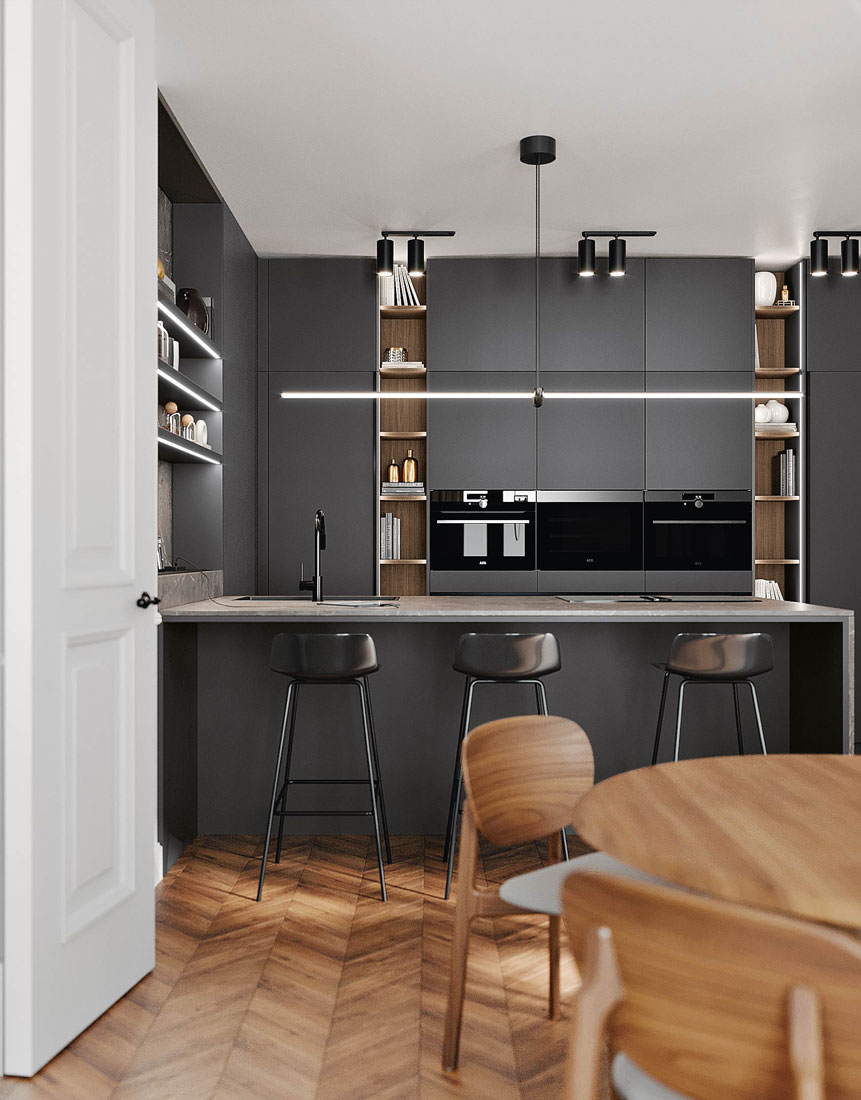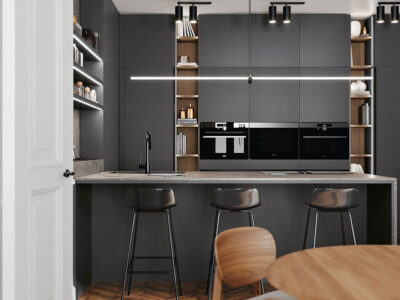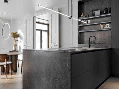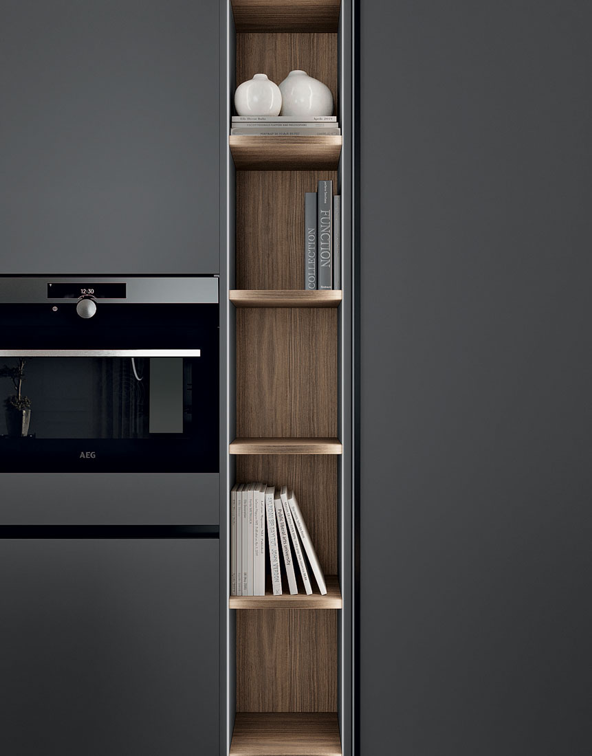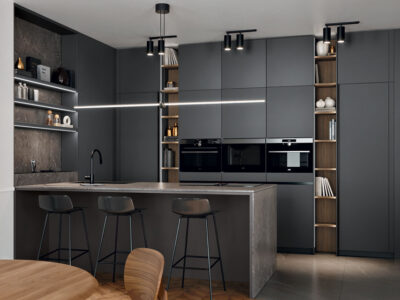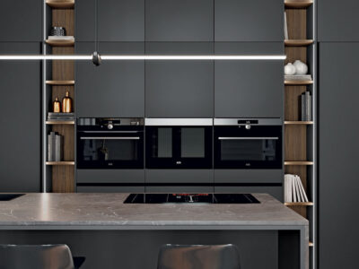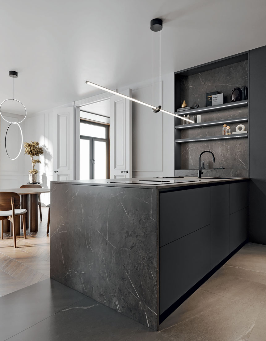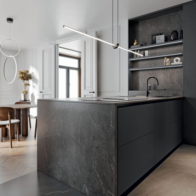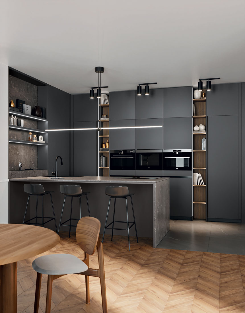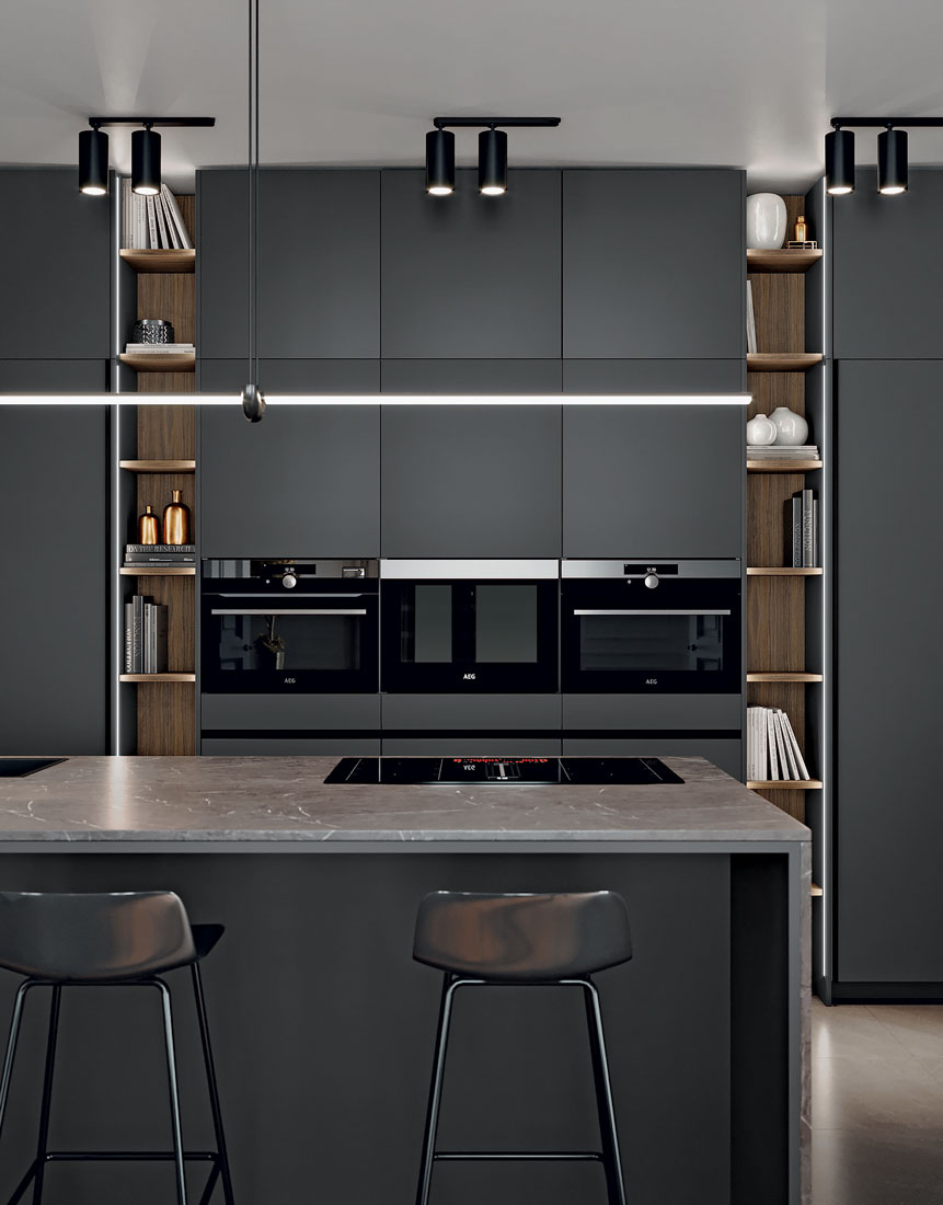 Nella composizione presentata, la cucina Essenziale esprime al meglio la sua anima: le ante in finitura soft matt Antracite donano profondità e matericità alla scena; i piani di lavoro in Marmo Greystone introducono un accento prezioso e naturale; i profili gola e le maniglie integrate in colore nero evidenziano la linearità del gesto quotidiano.