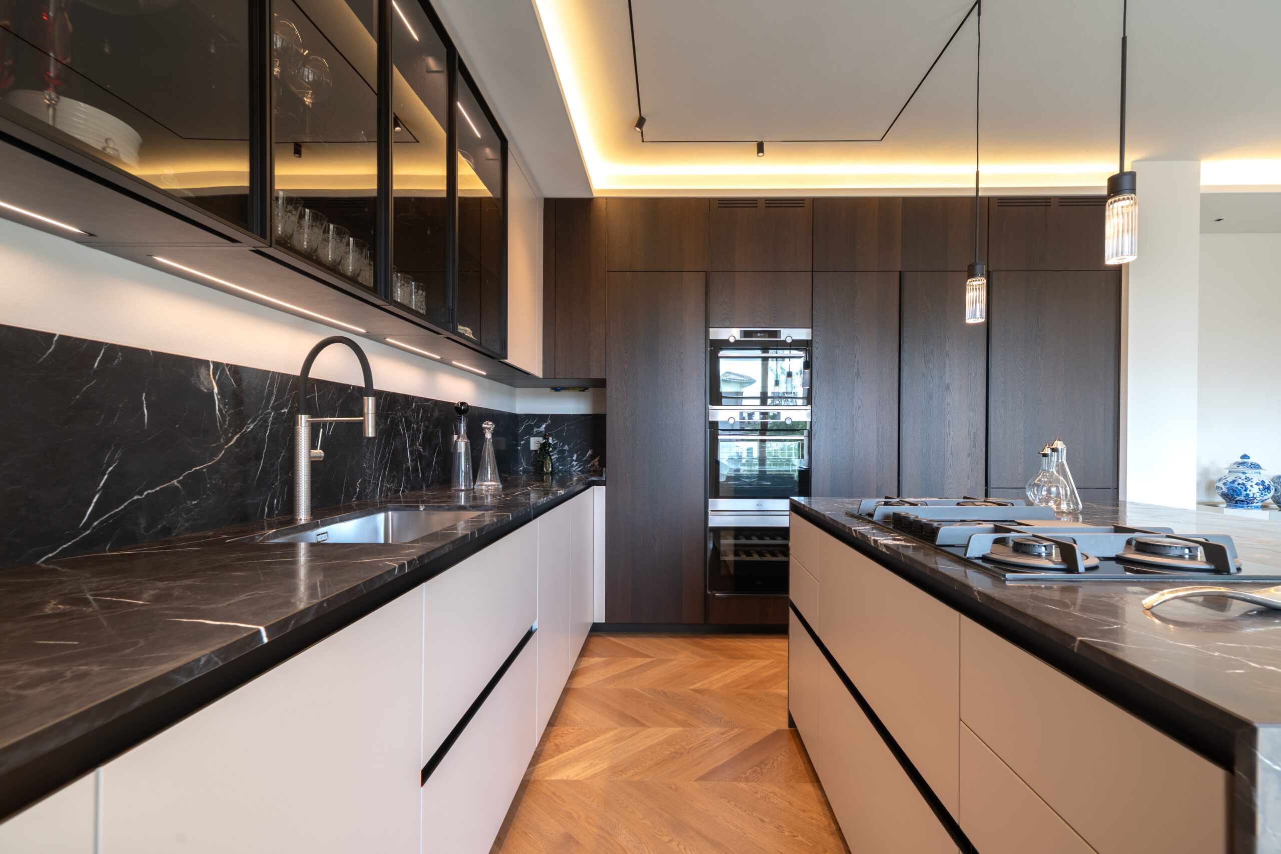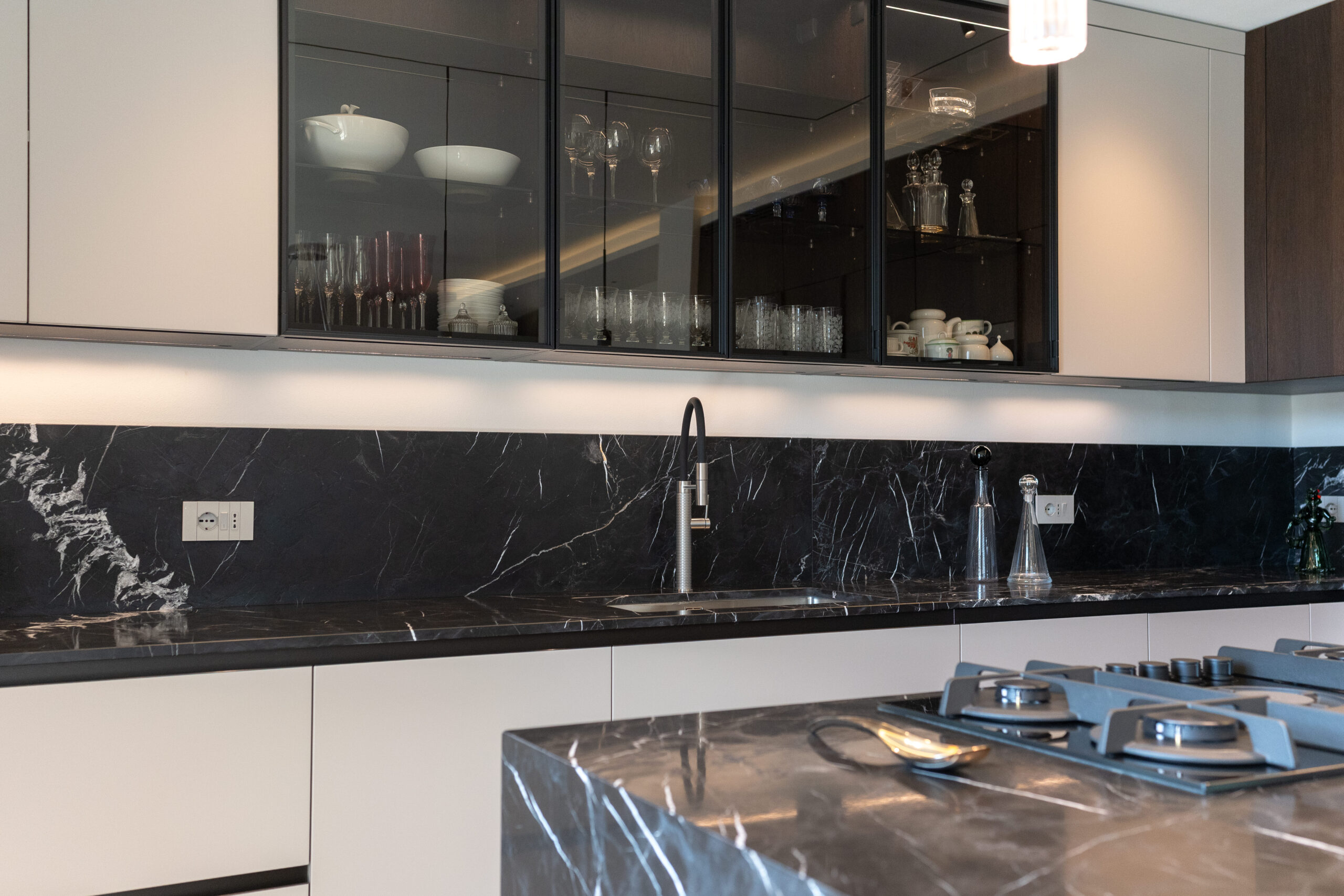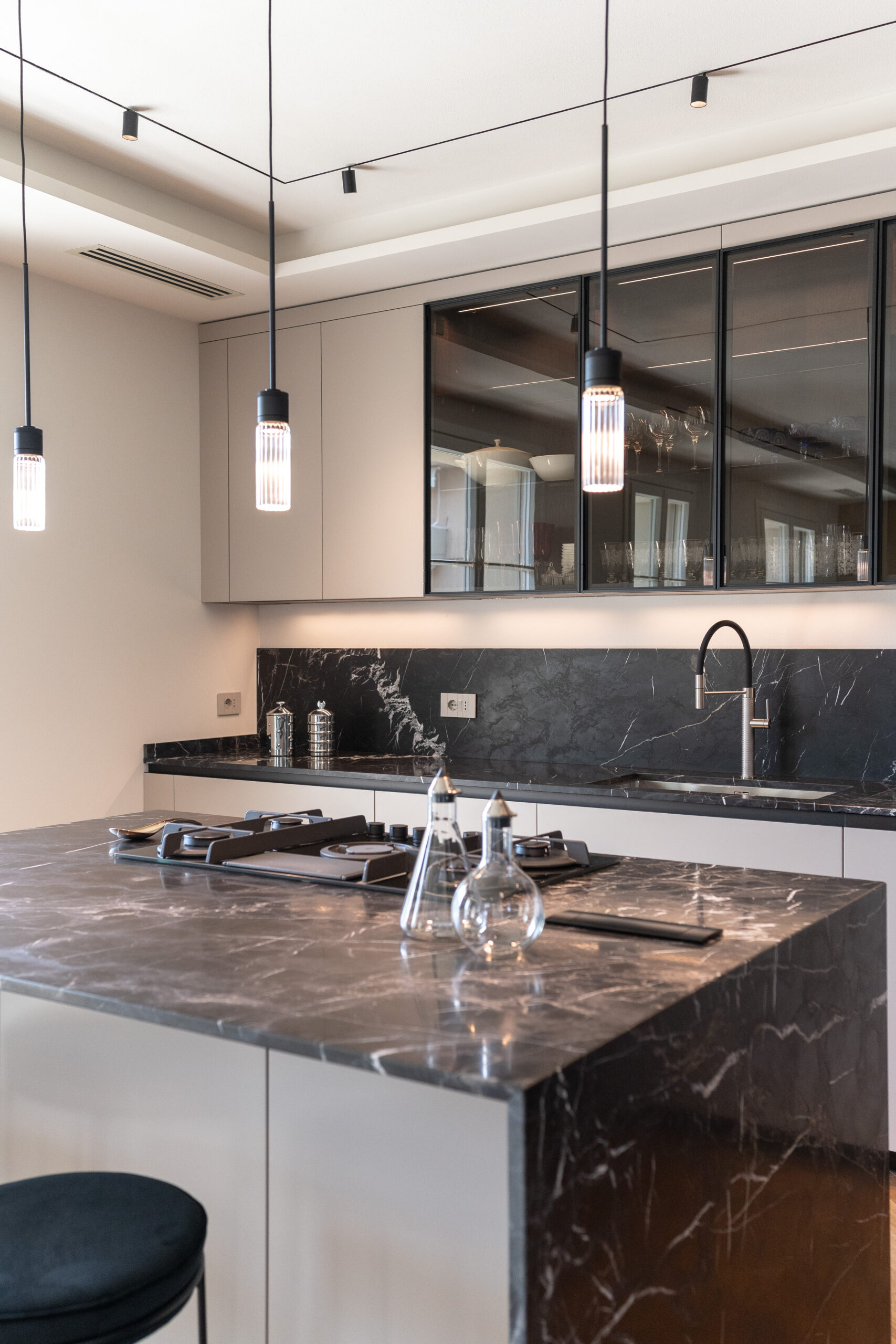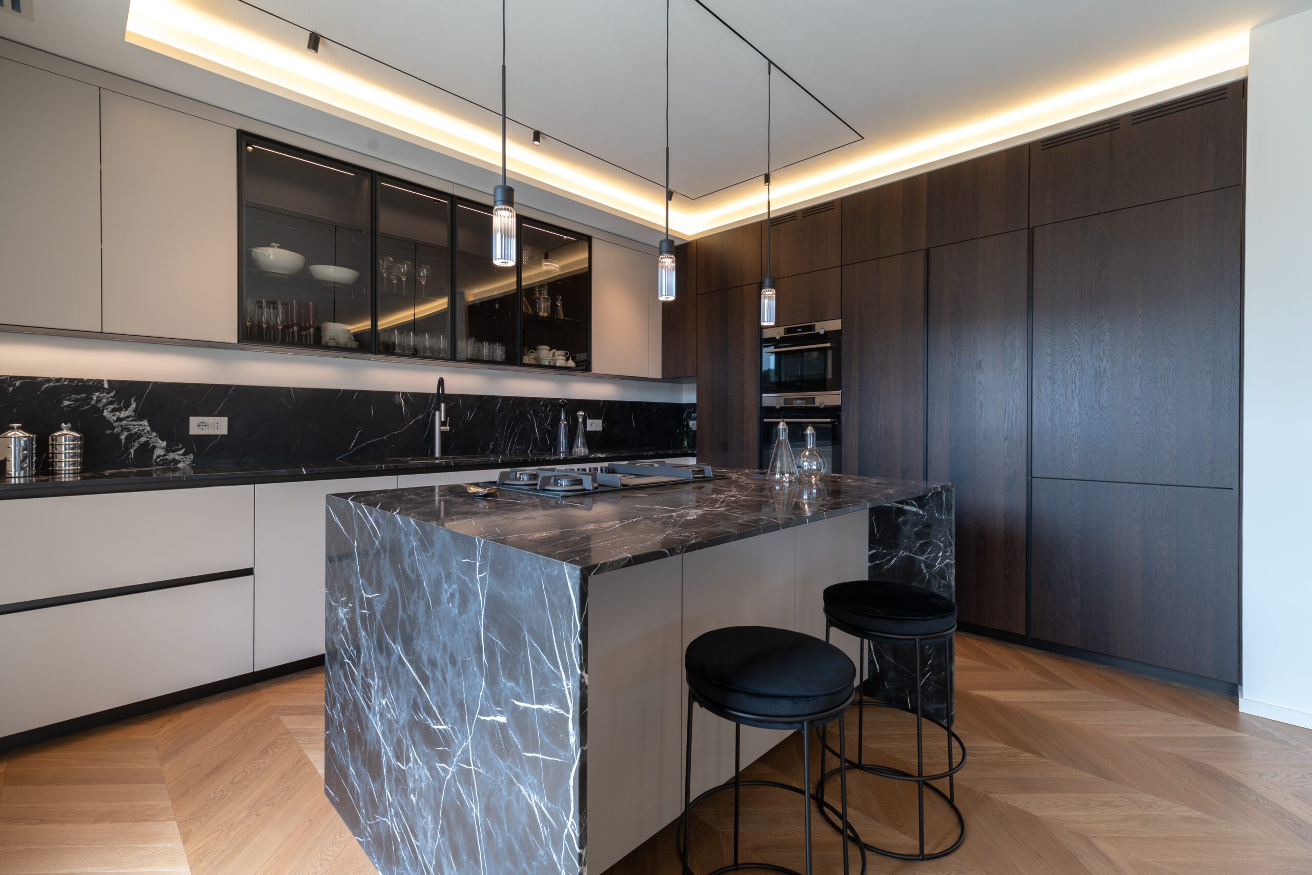 The matte lacquered base units in natural earth tone, enhanced by a double frame and black groove profiles, convey a contemporary yet sophisticated aesthetic. The central island takes center stage, featuring a Black Marquinia marble top with full-height side panels, which emphasize continuity and elegant lines.