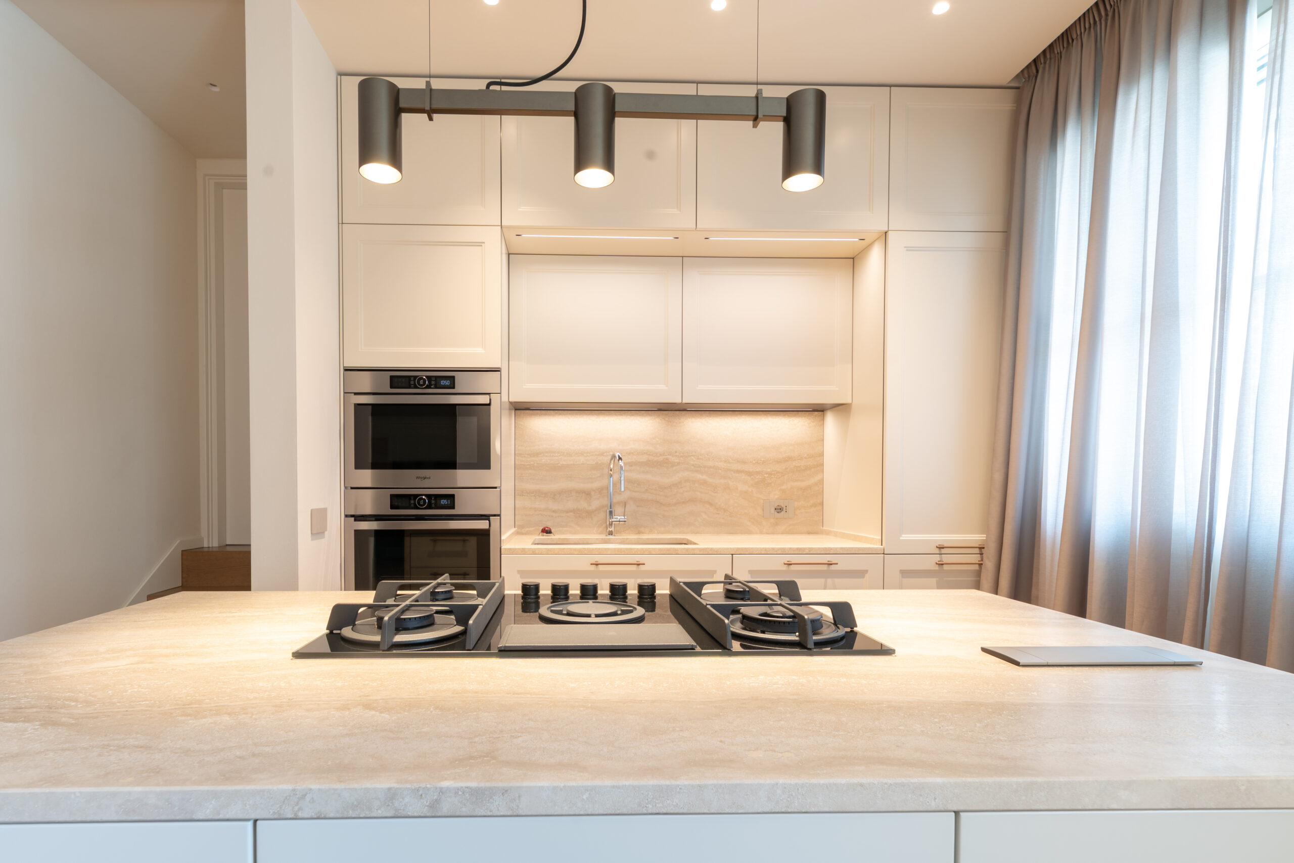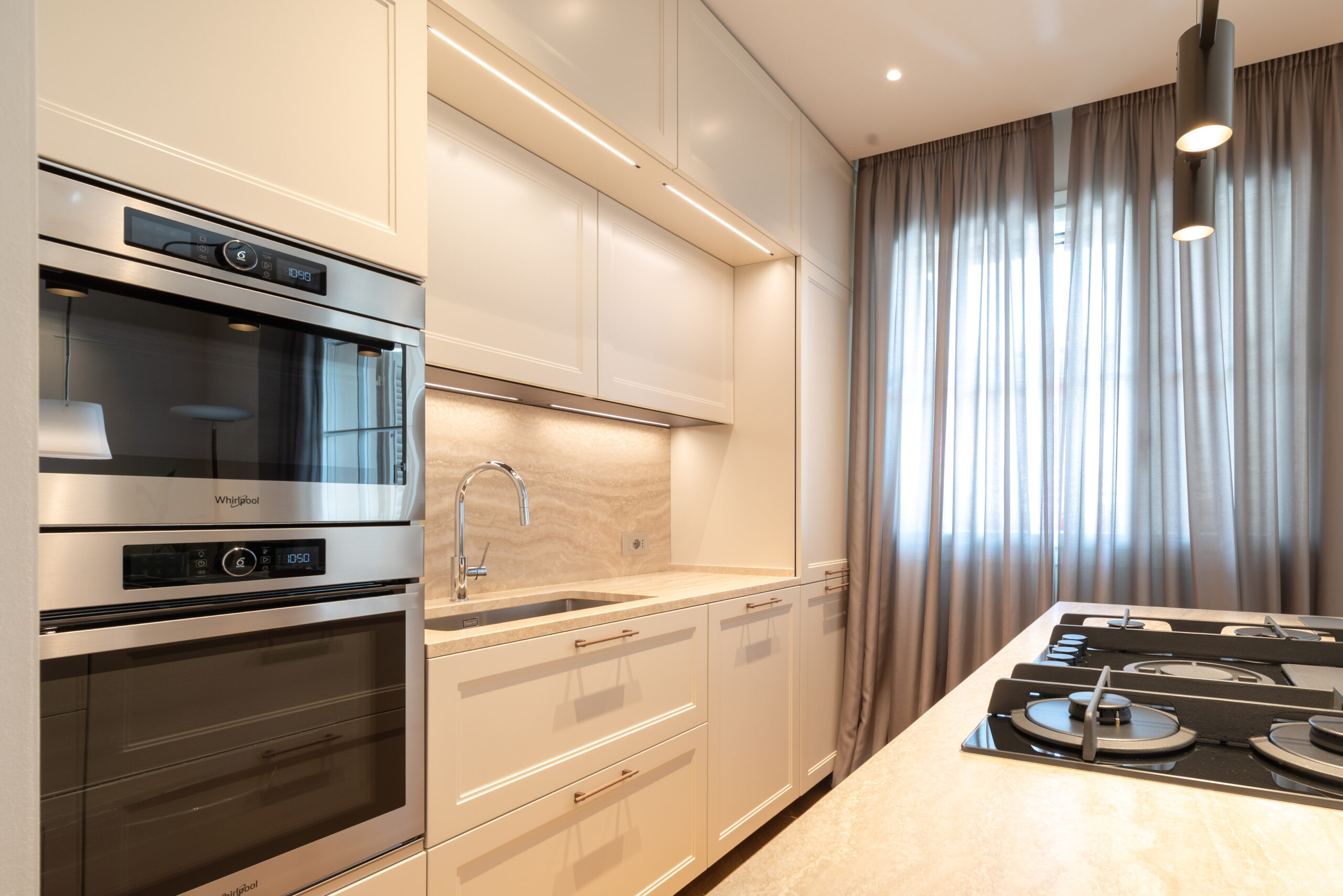 The backsplash behind the worktop, also in travertine, blends harmoniously with the surfaces and enhances the natural light within the room.