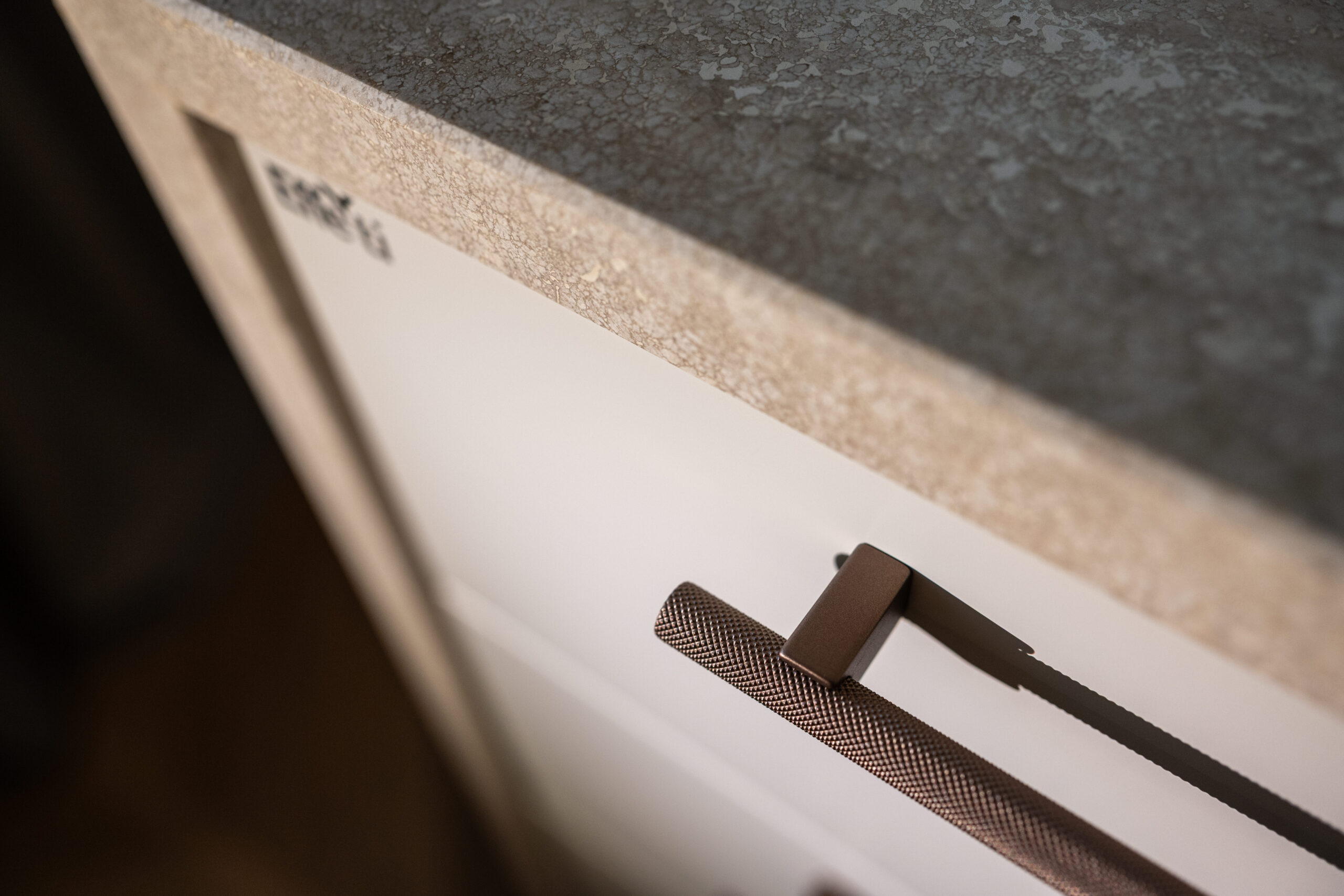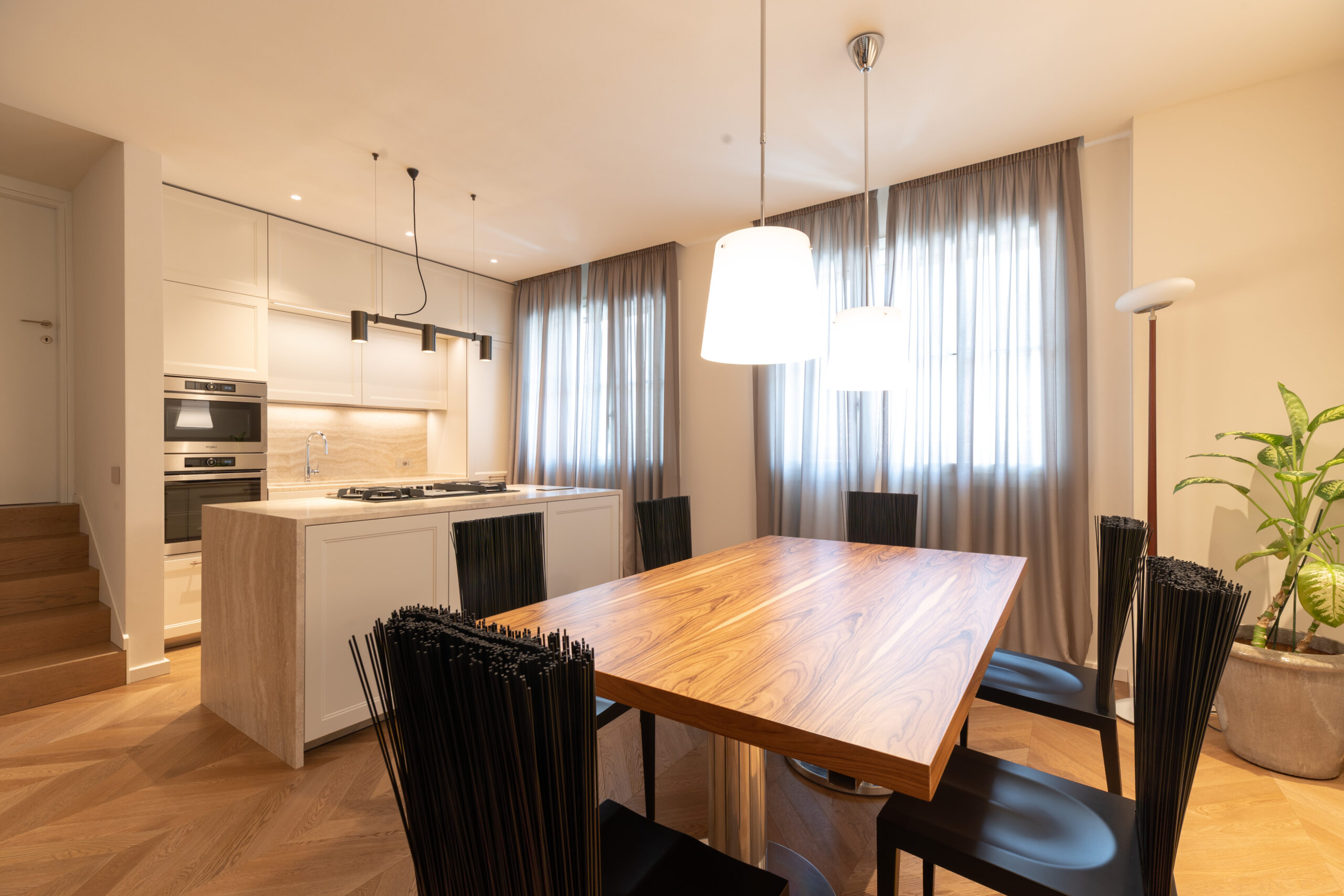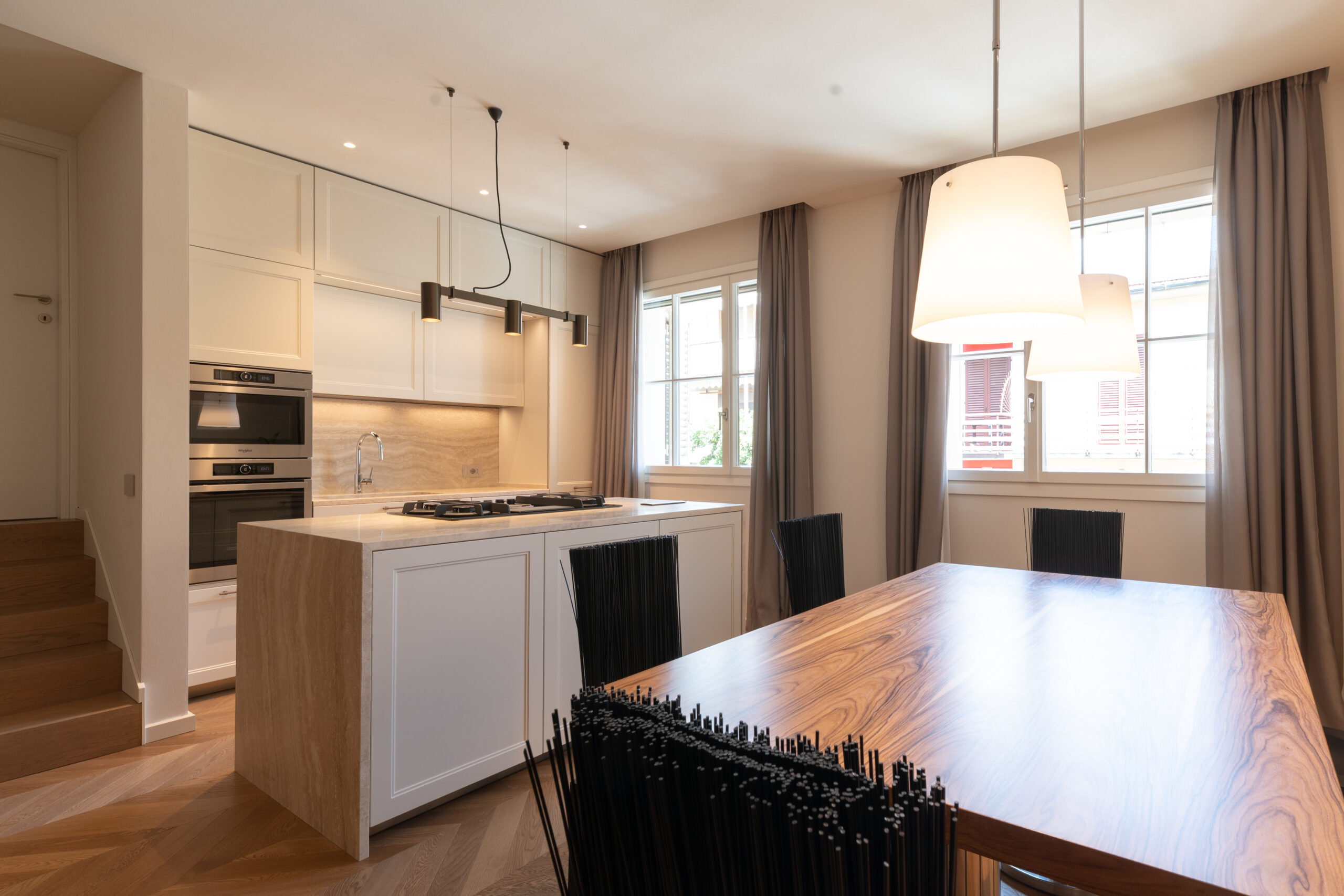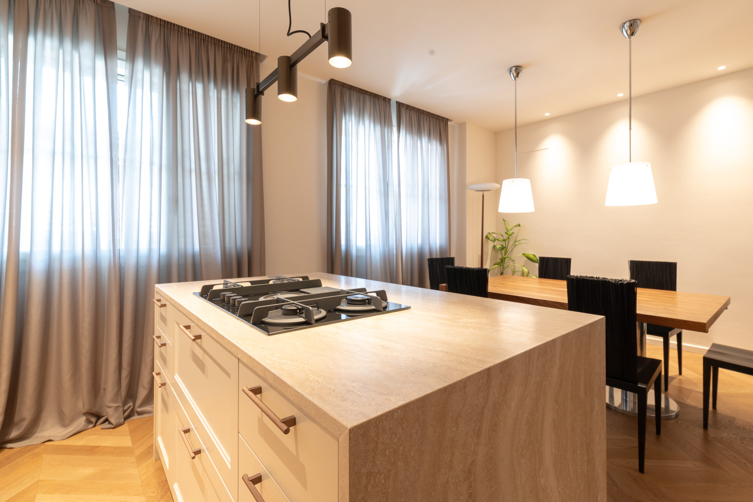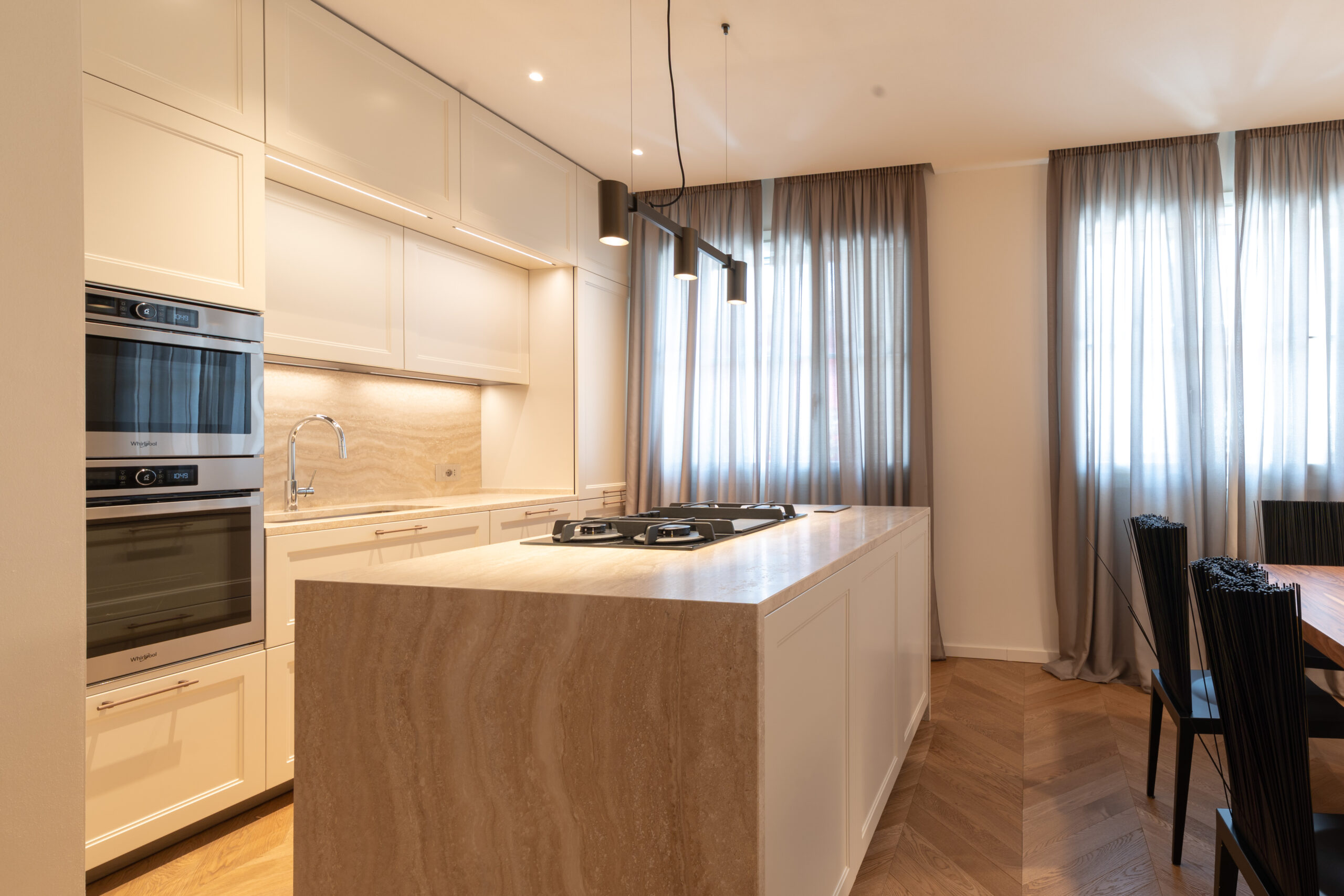 At the heart of the space is the central island, featuring a travertine worktop with full-height side panels, which houses the operational area and enhances the material continuity.