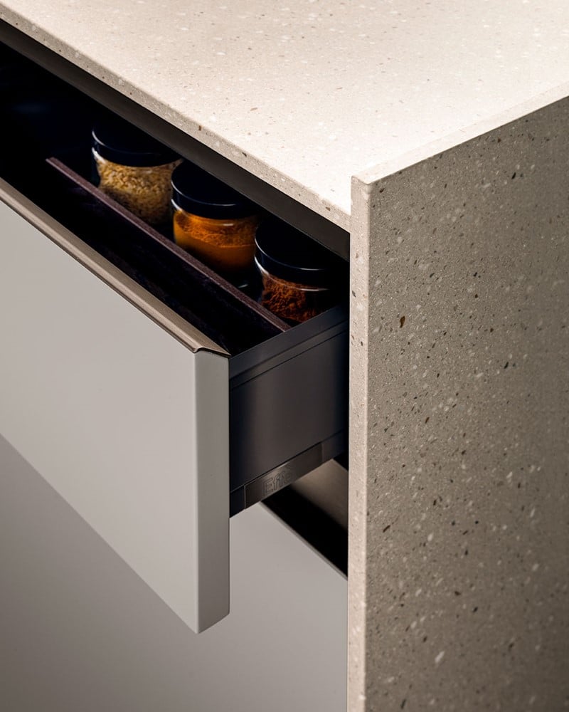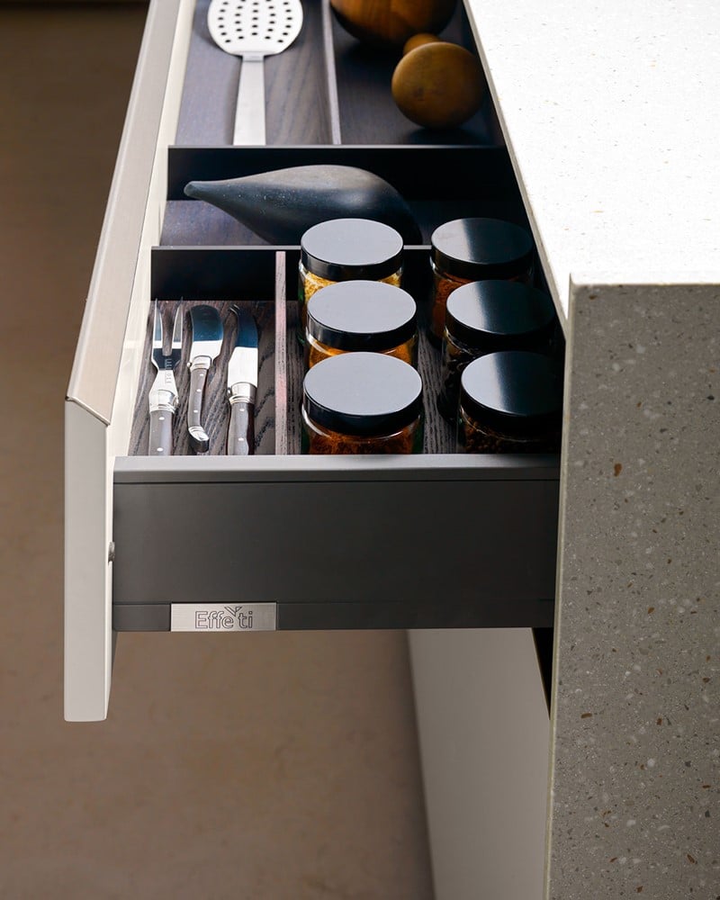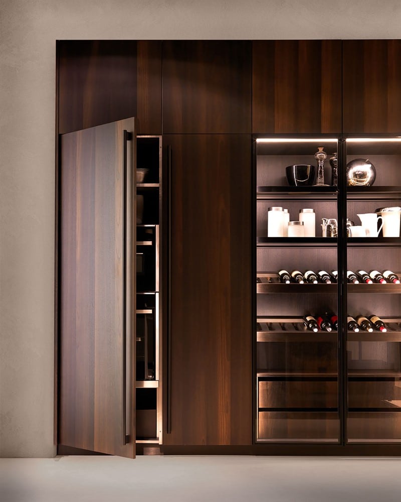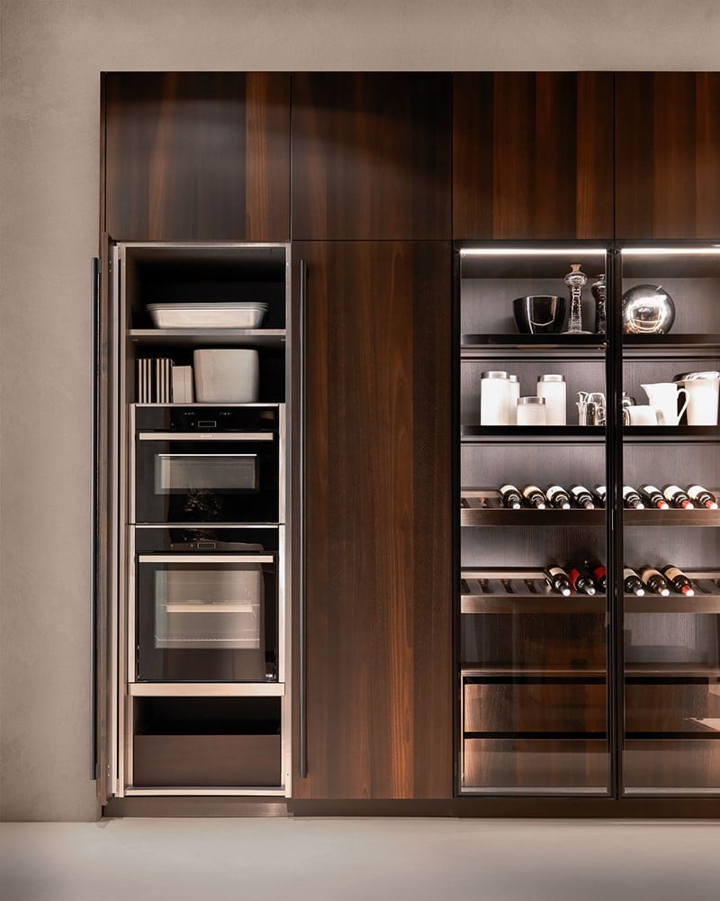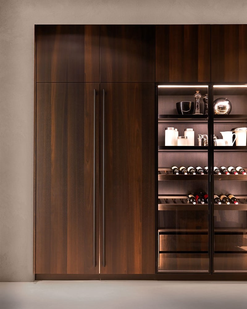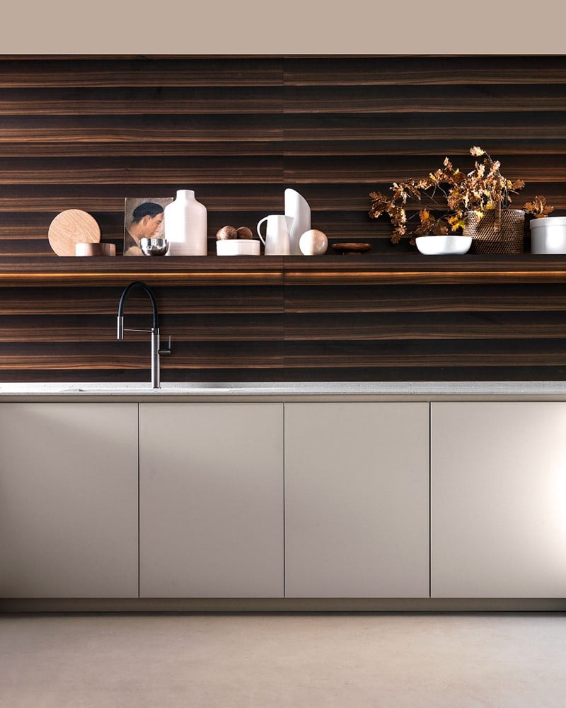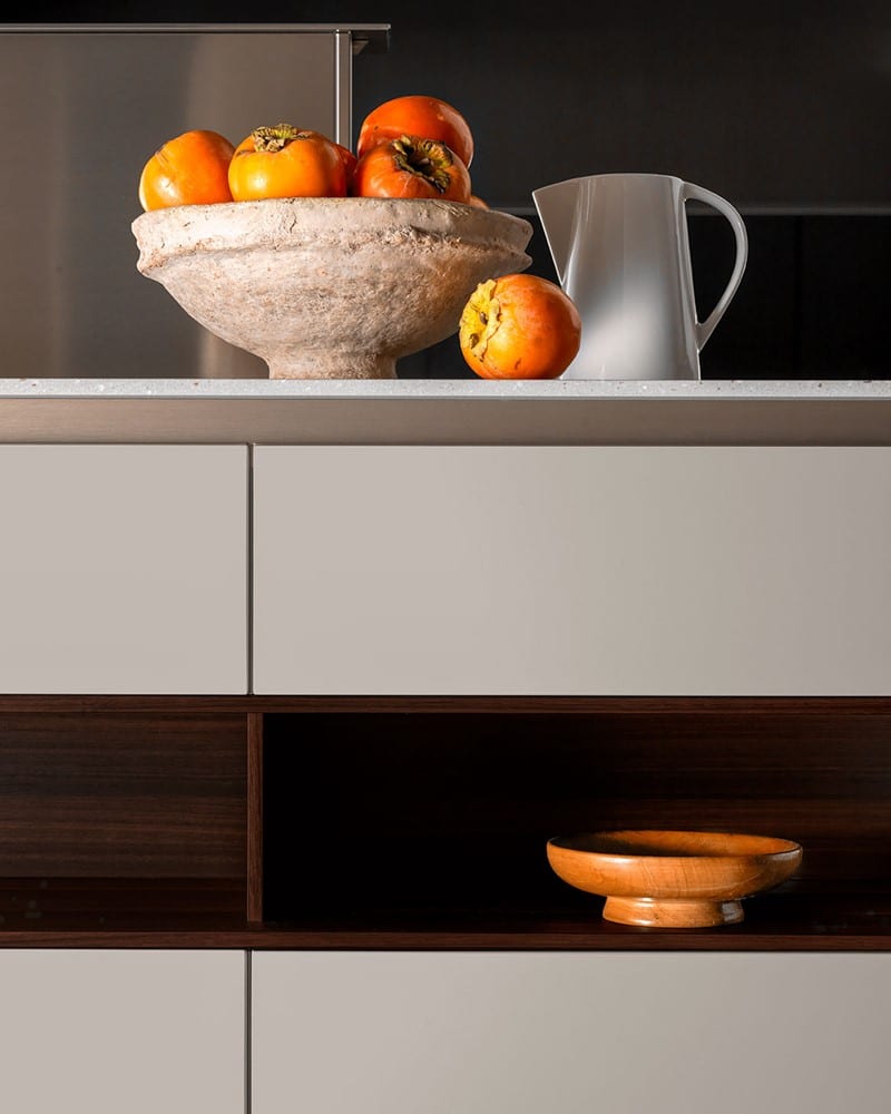 E0 è disponibile in un’ampia varietà di finiture laccate opache e lucide, laminate opache o S05 matt, effetto legno o metallo, fenix, Laminam, essenze lignee e vetro.