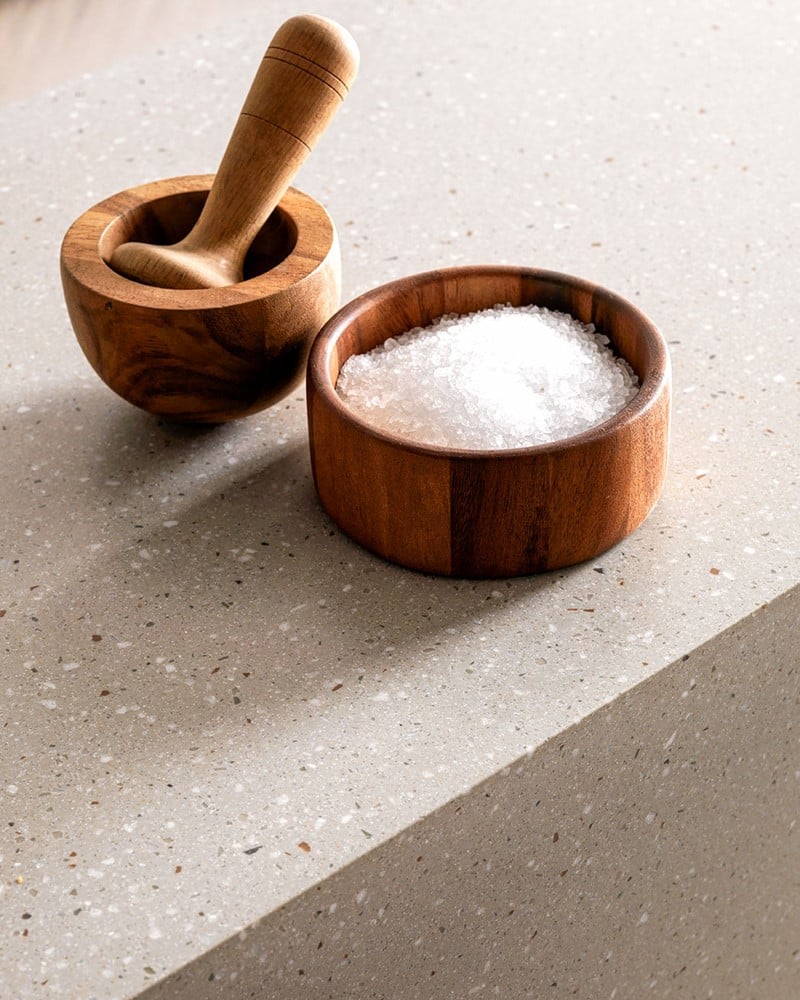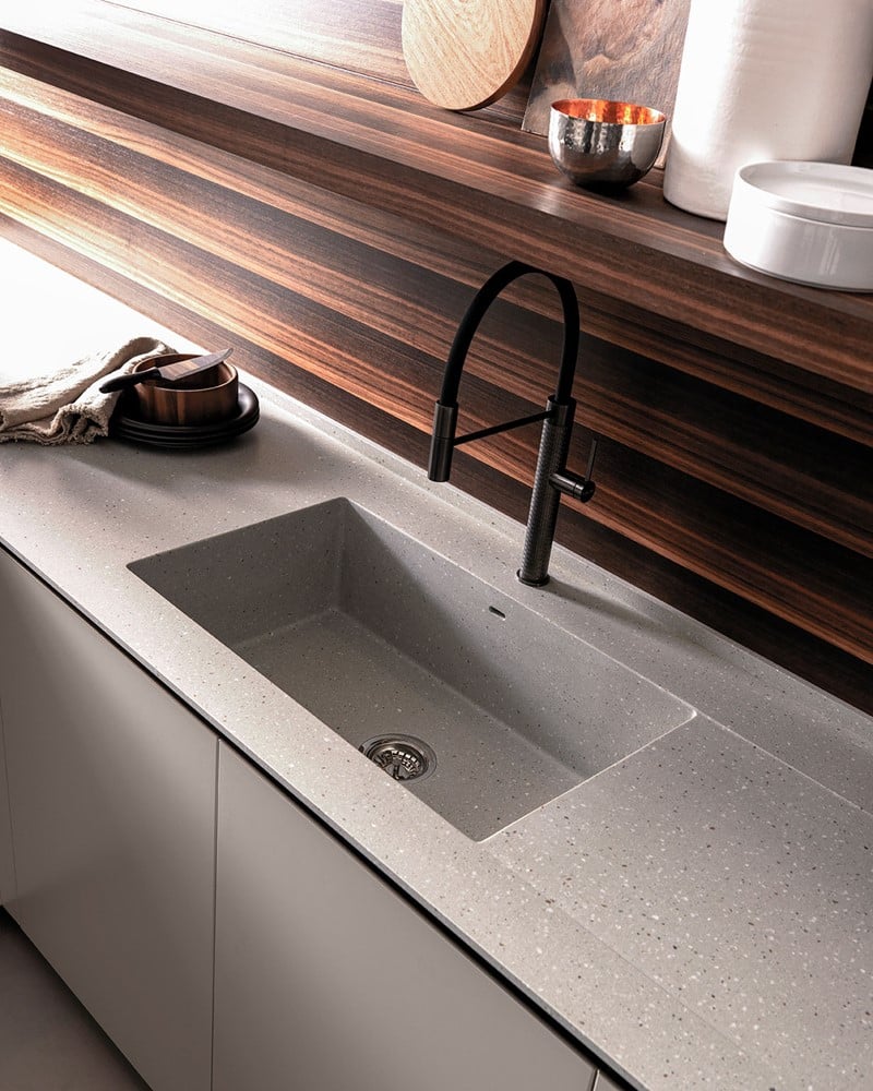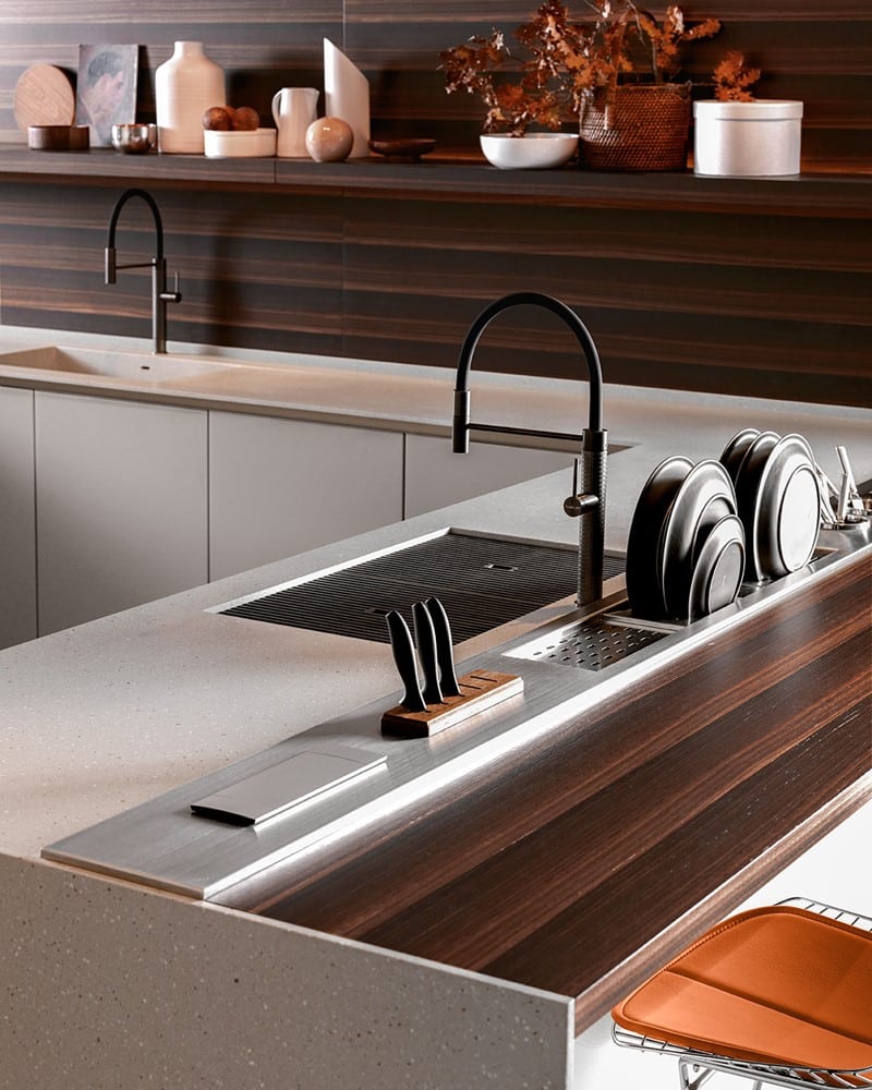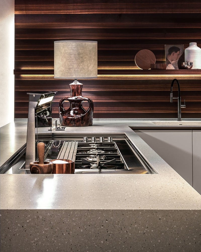La zona cottura e lavaggio prevede due piani cottura e induzione con cappa integrata sul top e una vasca di dimensioni 70×40 cm Inox filotop. Particolarmente degno di nota è il top, proposto in Laminam Pietra di Savoia Perla finitura bocciardata di spessore 12 mm. Il bancone snack è invece realizzato in impiallacciato Rovere Termizzato spessore 60 mm.