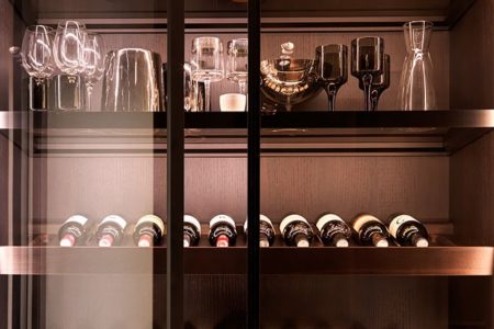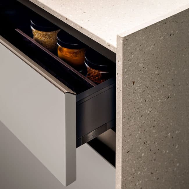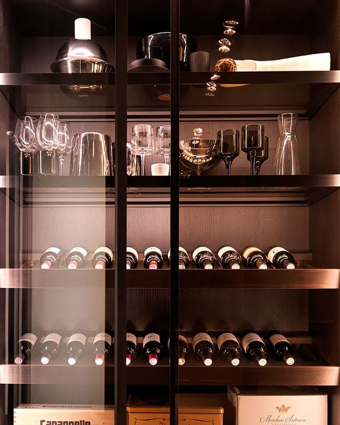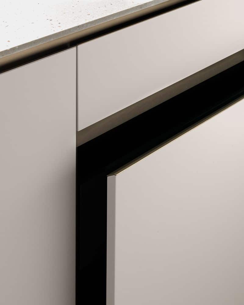 Lo stile toscano prettamente contemporaneo della cucina senza maniglie E0 è esaltato dalla struttura in nobilitato grigio con bordo in vero alluminio e rifinito in bronzo. La medesima finitura è stata destinata alla gola e al profilo dell’anta, mentre le basi sono in Laminam Pietra di Savoia con finitura in Perla bocciardata.