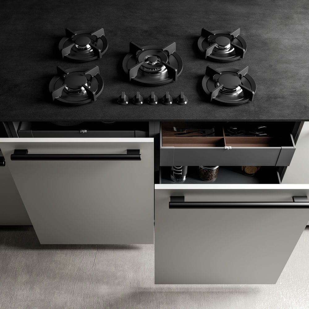 The E1 is much more than a simple kitchen model; it’s an invitation to explore your creativity and shape your daily environment. Imagine, design, and build custom compositions, choosing from a selection of ergonomic handles that provide a distinctive and functional touch. With E1, your kitchen becomes an extension of your lifestyle, reflecting your personality in every detail.