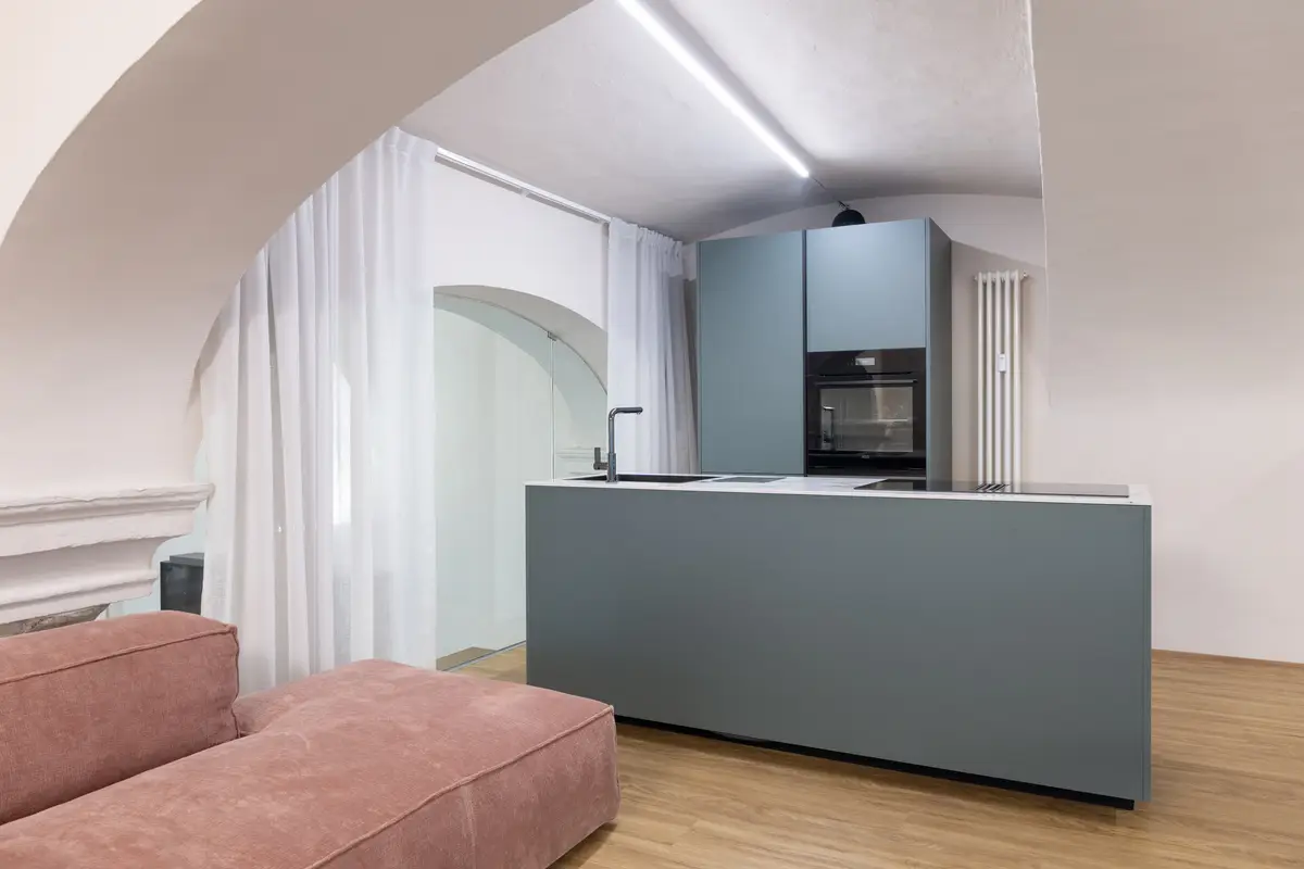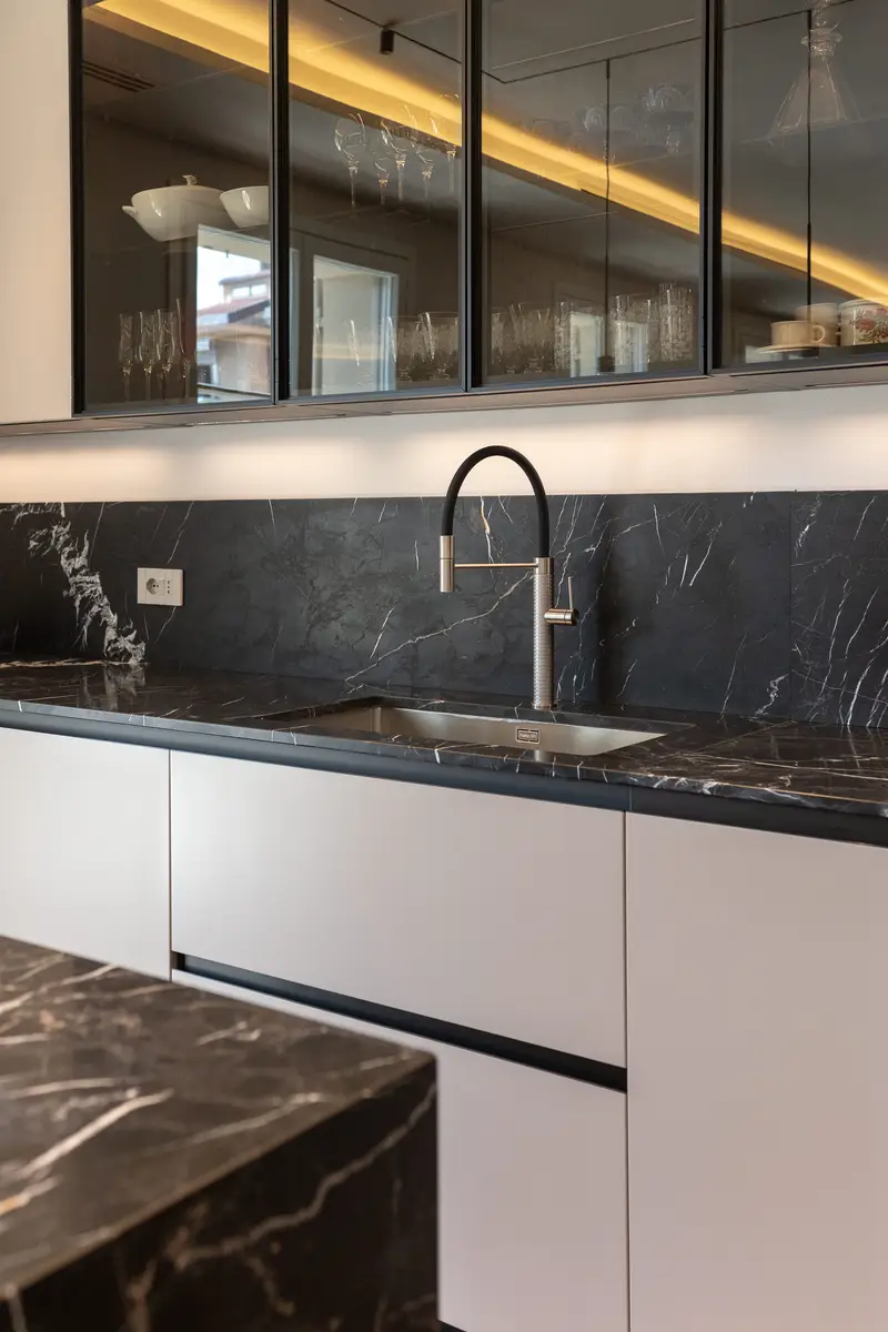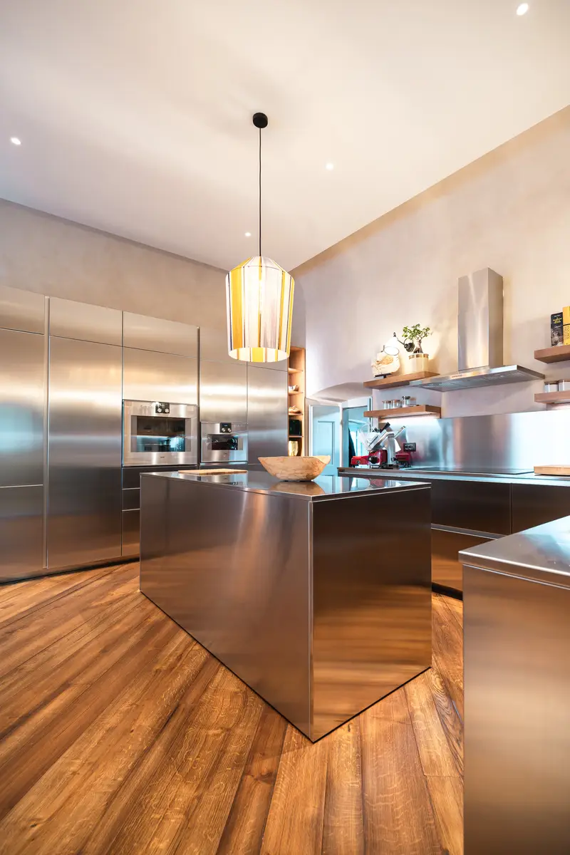 La sua forza è la robustezza, ma anche la varietà: oggi il laminato permette finiture che vanno dalle riproduzioni realistiche di legno e pietra a superfici soft-touch, opache profonde o satinate, offrendo libertà stilistica praticamente illimitata. È una scelta che abbina praticità e bellezza, perfetta in contesti contemporanei e in open space dove cucina e living dialogano senza interruzioni.